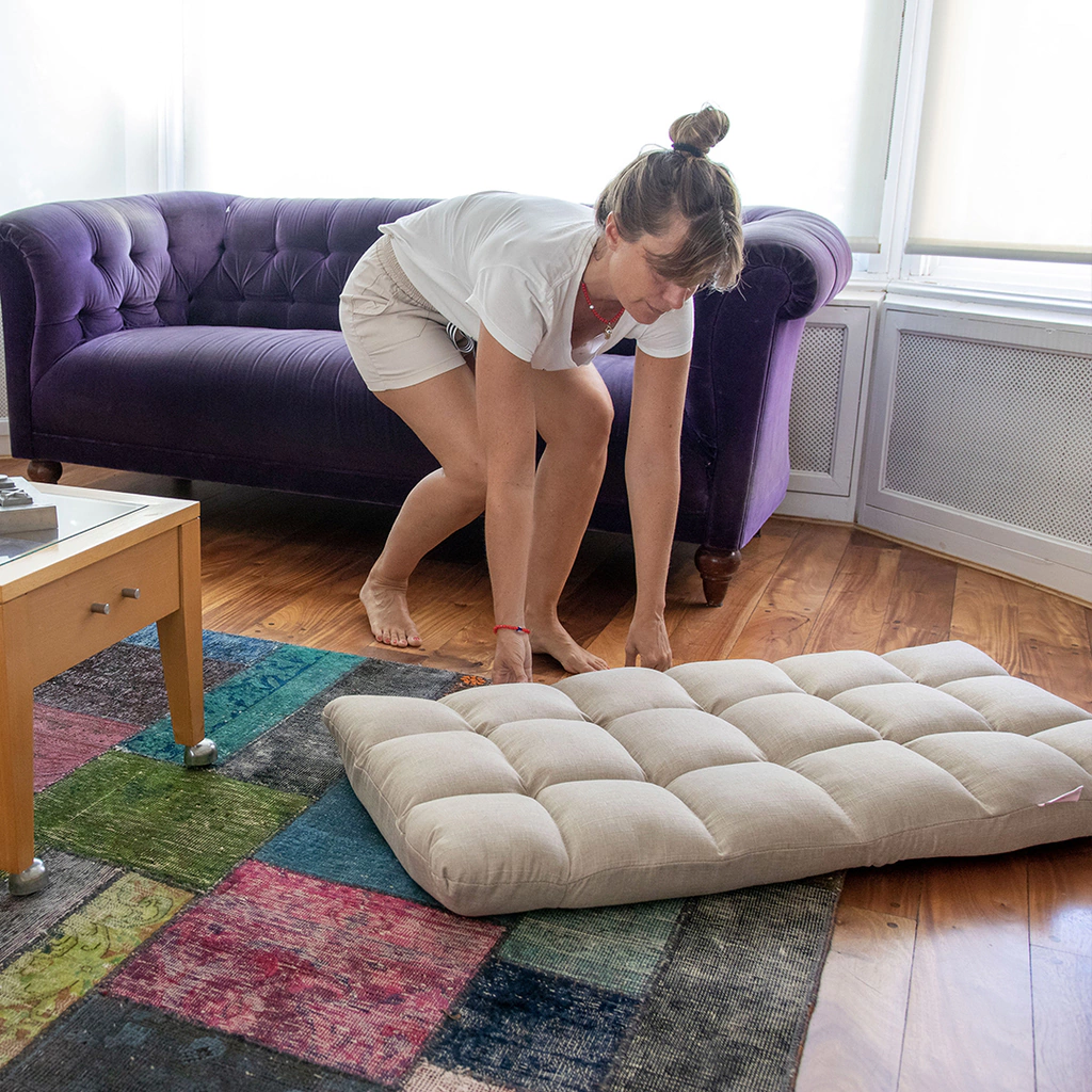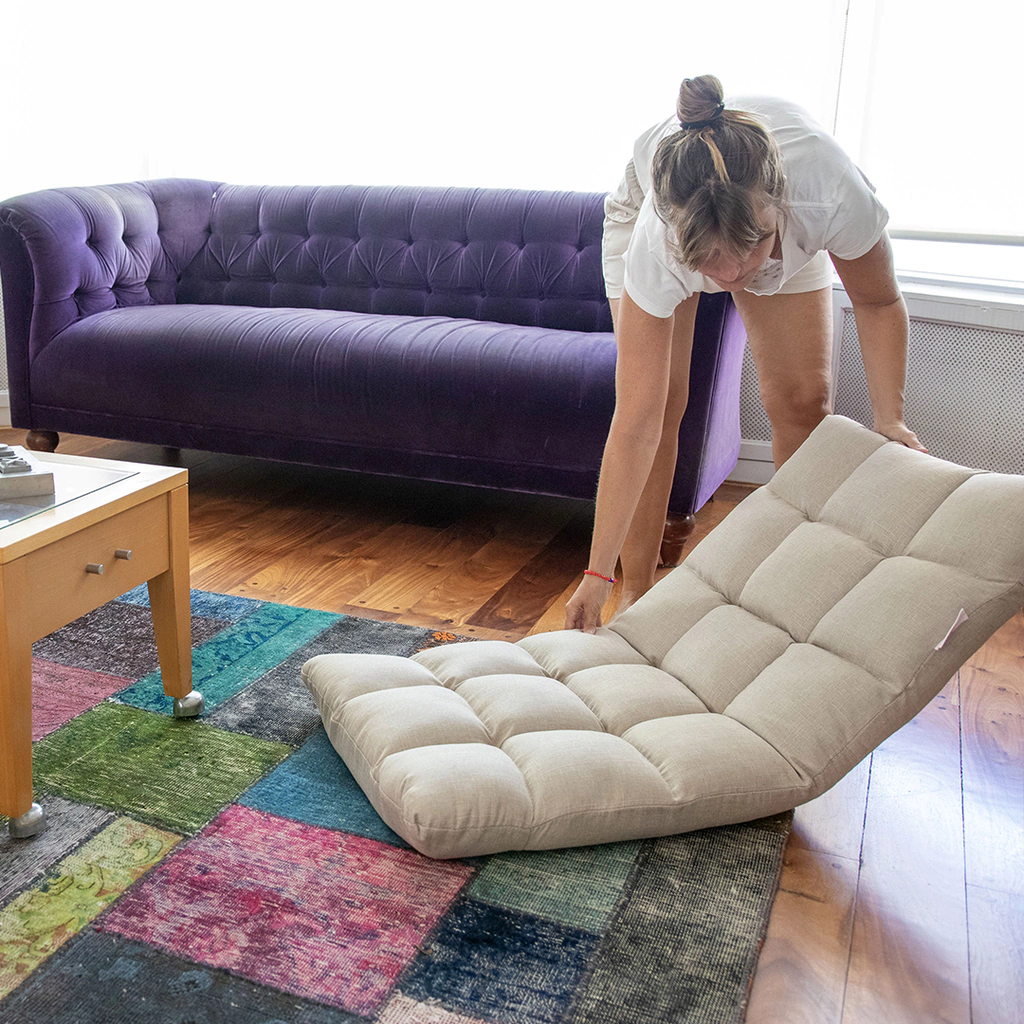 Podes usarla como colchoneta en su posición totalmente plana, meditar en la posición de 90 º y leer, o trabajar con to notebook en alguna de las otras 3 posiciones de reclinadado que ofrece éste cómodo y novedoso sillón.